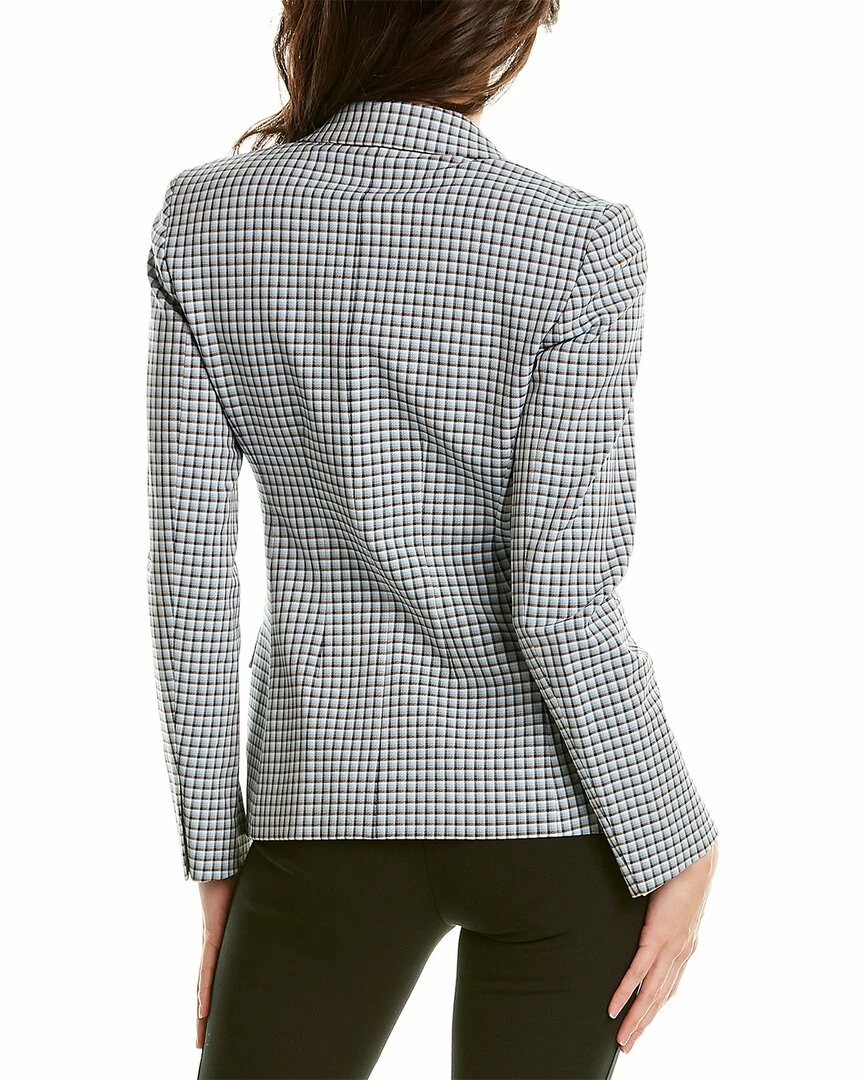 - Double-Breasted Linen-Blend Blazer in blue multicolor check with notch lapel, two front pockets, and vented cuffs